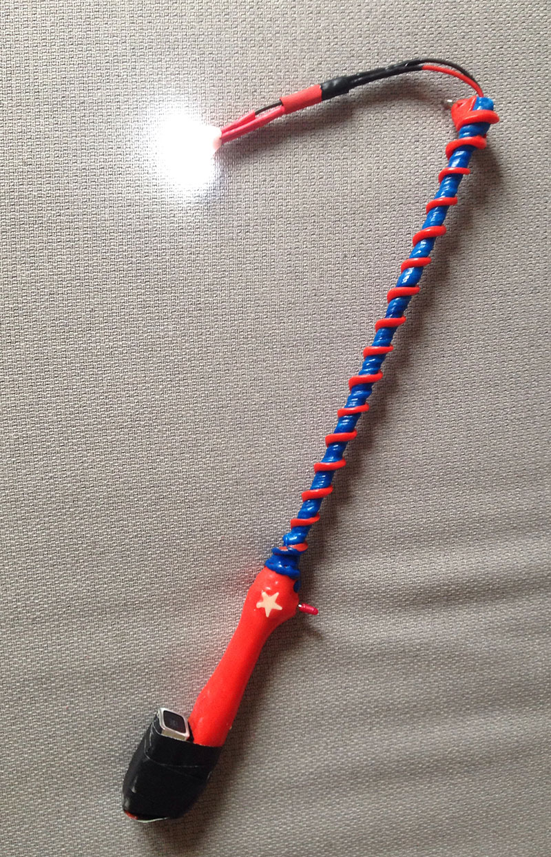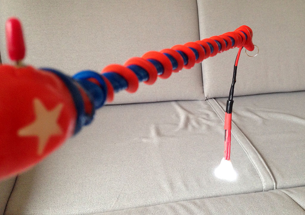 Da die ganzen erhältlichen Laternenstäbe aus Fernost sind und auch noch von miserabler Qualität, habe ich mir einen aus Gorillaplastic selbst gebaut. 9Volt Block, Kippschalter, 3LEDs und entsprechende Vorwiderstände, Kabel und etwas Schrumpfschlauch. Ein CFK Stab dient als Gerüst. Materialkosten liegen bei ca. 5 Euro und damit gleich auf mit der billgen Plastikware aus dem Discounter.